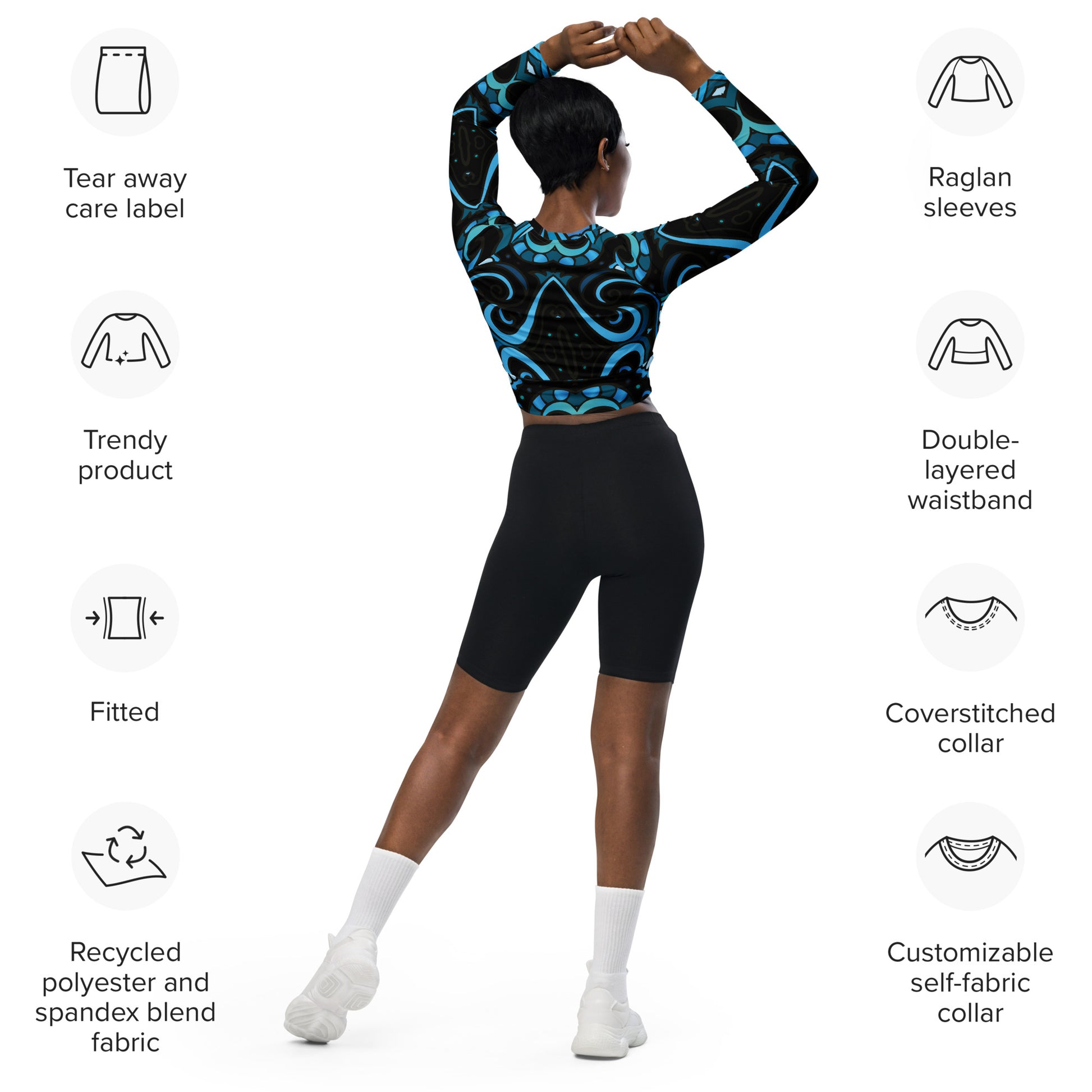 This long-sleeve crop top is made of recycled polyester and elastane, making it an eco-friendly choice for swimming, sports, or athleisure outfits. The crop top has a tear-away care label and a wide, double-layered waistline band for a comfortable fit.