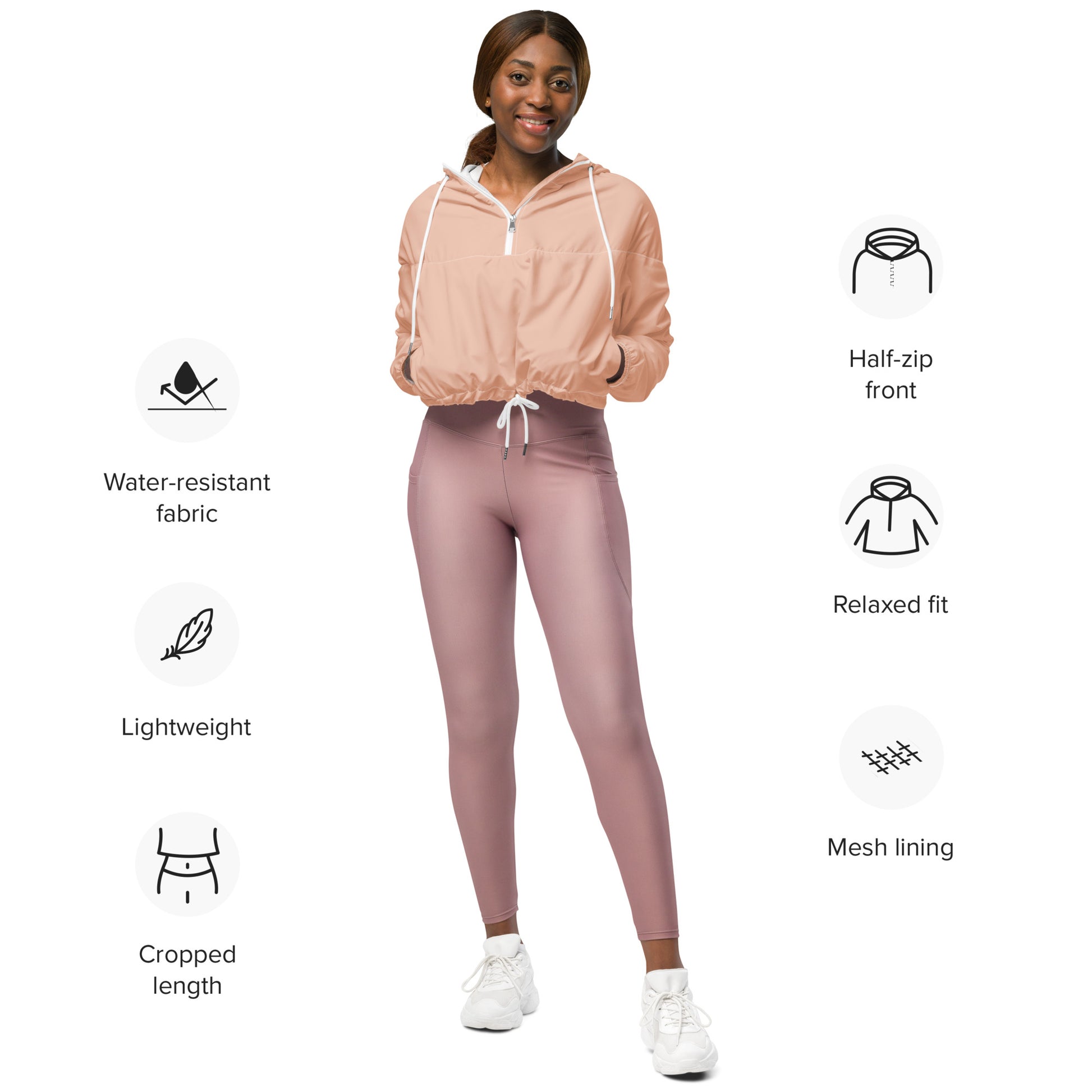 Hike in style without the rain getting in the way—this cropped windbreaker is lightweight, waterproof, and suitable for every kind of adventure. Features include side-slit pockets, breathable mesh lining, and adjustable drawcords on the hood and waist to support all your stylish outdoor looks.